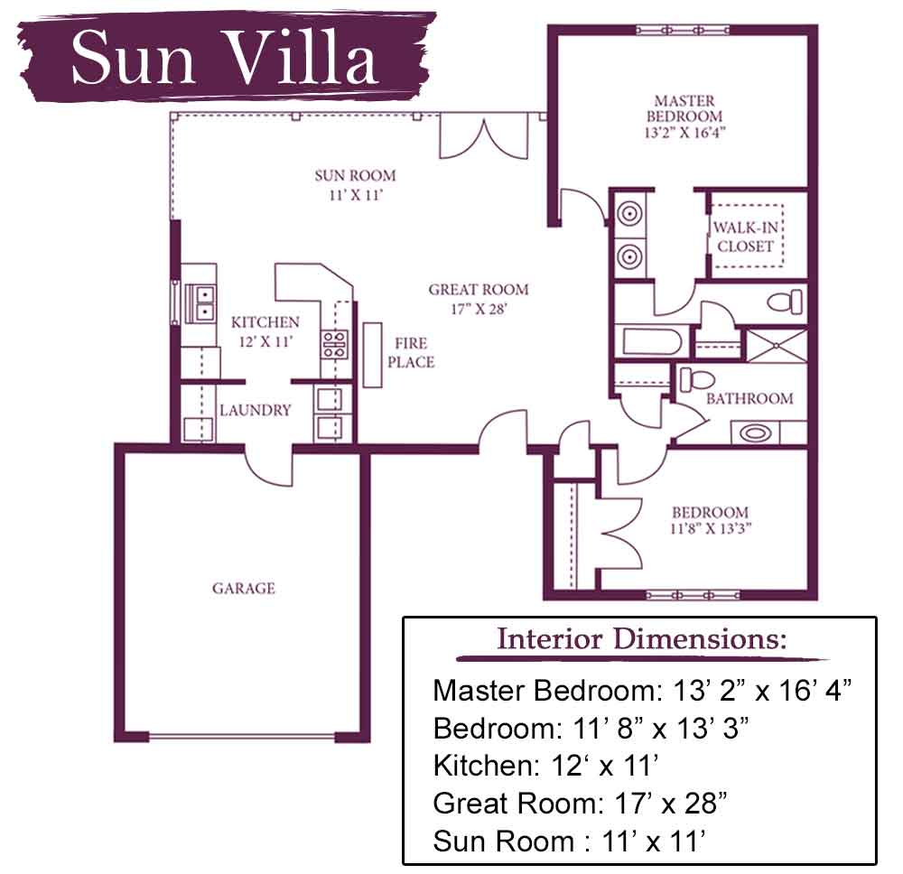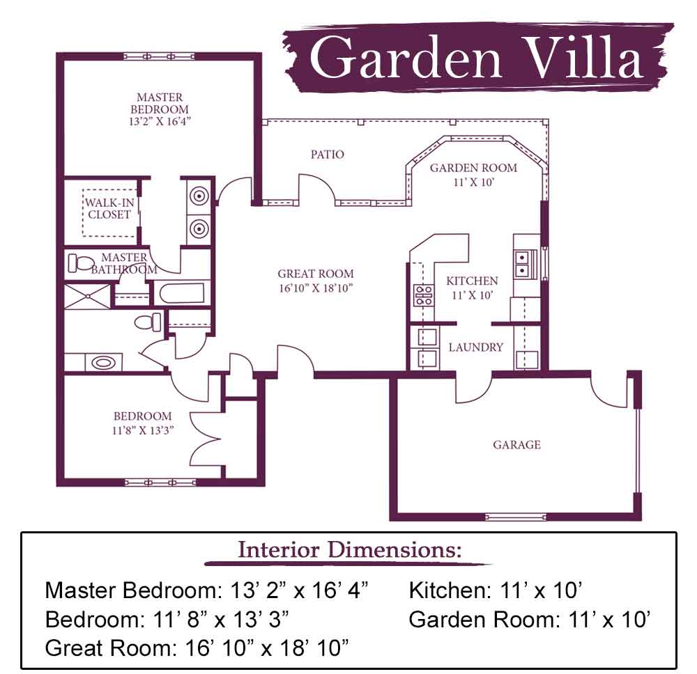 Walking into the Garden Villa or Sun Villa is like walking into a little piece of Heaven. Step into the comfortable living room, and enjoy a heart-warming fire place with plenty of sunlight from the oversize windows and an open floor plan. A spacious, modern kitchen with breakfast bar allows for simple dining or elaborate entertaining. Two gracious bedrooms, two baths, and ample closet space make the package complete! The Villas face tree-lined streets creating a cozy neighborhood atmosphere.